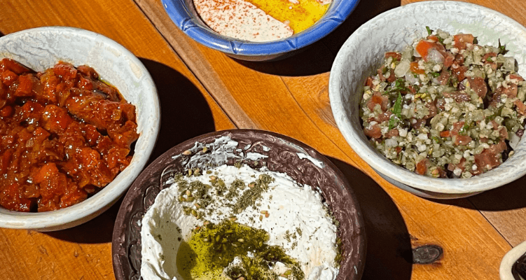 Greek Mezze Platter with Tzatziki, Htipita (Greek Red Pepper and Feta Dip) with accompaniments | Mediterranean Rice Pilaf with Fide (thin noodles) | Chicken Gyros with Tzatziki and Tomato Salad | Ravani: Greek Semolina Sponge Cake