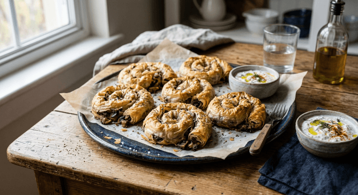 Maroulosalata - Traditional Greek Salad | Greek Tzatziki Sauce | Manitaropita - Mushroom and Phyllo Spirals | Cod with Capers and Garlic | Koulourakia - Traditional Greek Butter Cookies