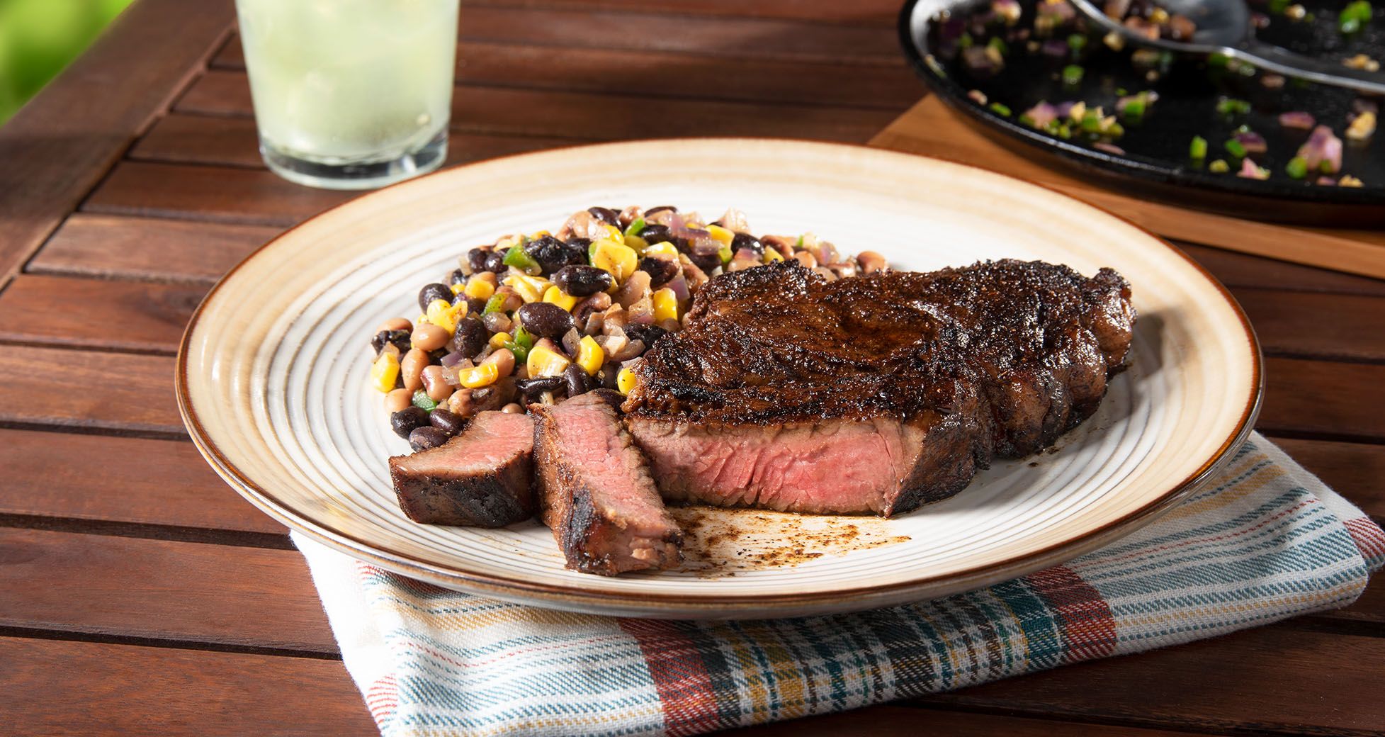 - Remove pan from heat, stir in black-eyed peas, beans, corn and vinegar. Serve with steaks.