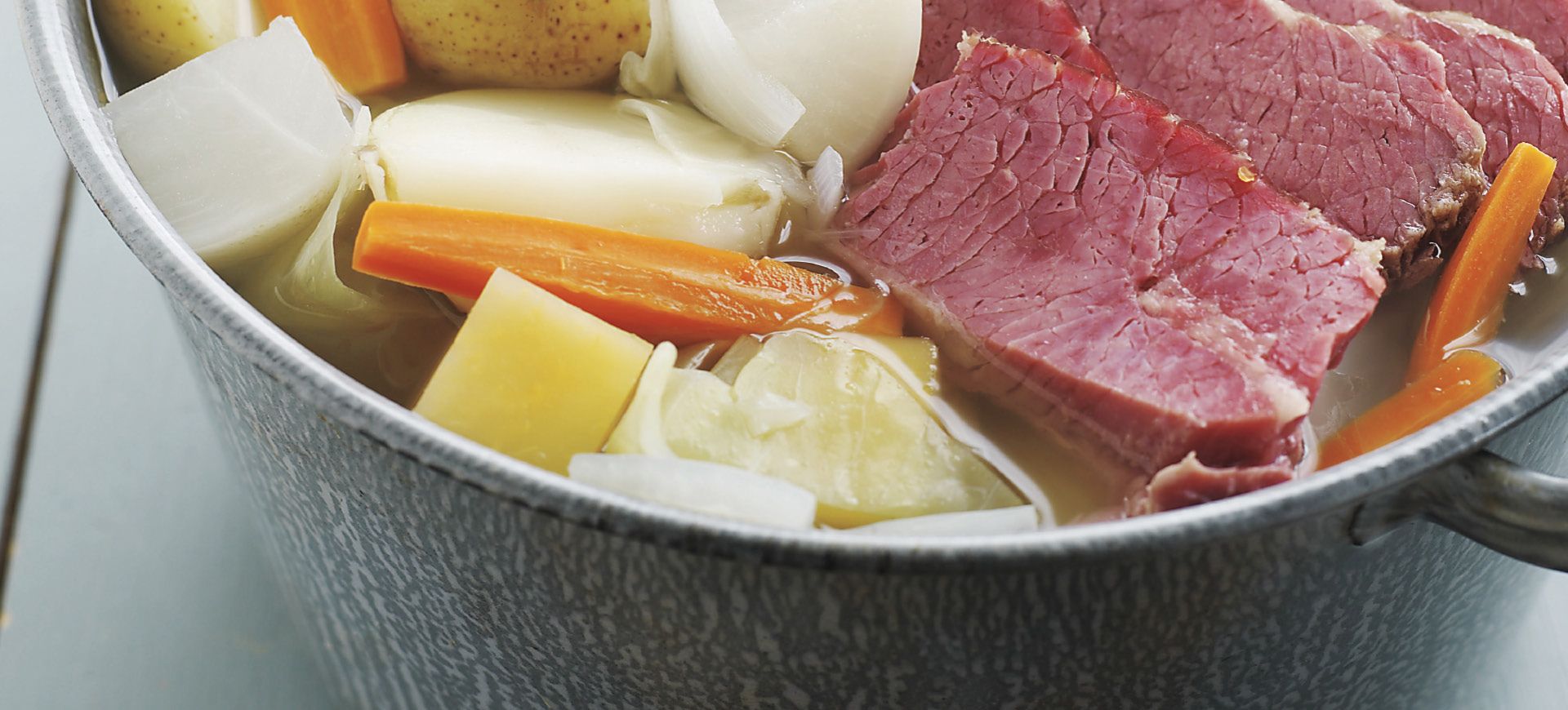 - About 30 minutes before corned beef is finished cooking, in 6-quart saucepot, add potatoes, carrots and onions; arrange cabbage on top. Add enough water just to cover vegetables by 1". cover and cook over medium-high heat 45-60 minutes or until vegetables are tender. Transfer 2 to 3 cups of hot cooking broth from slow cooker (when beef is removed) to vegetables for flavor while cooking.