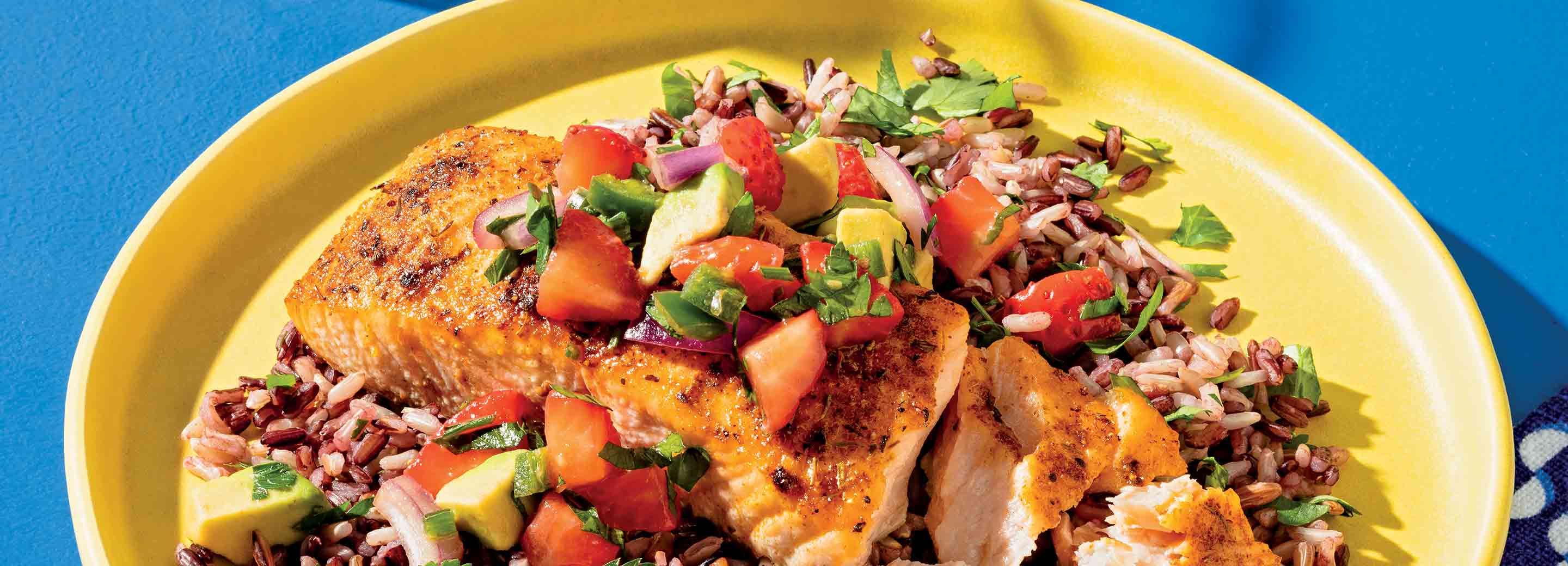 - Serve each roasted salmon filet with strawberry pico and 1/2 cup rice.