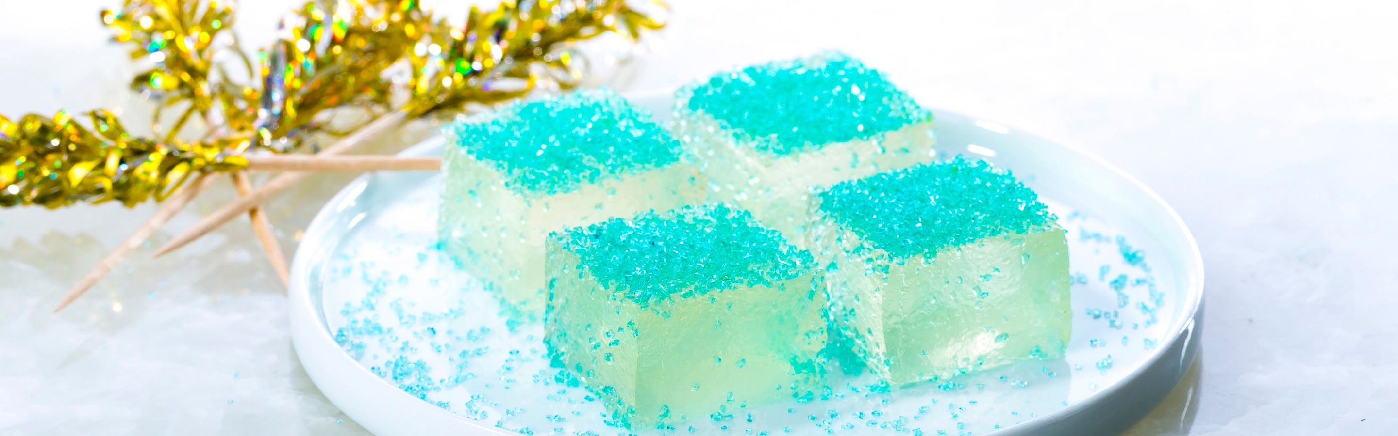 - Dip bottom of pan into warm water; carefully run knife along edges to release gelatin from sides of pan. Place cutting board over top of pan; quickly flip over to release gelatin onto cutting board. Cut lengthwise into 3 strips then cut crosswise into 5 strips to make 15 squares. Arrange squares on serving plate; sprinkle with blue sprinkles and insert a toothpick into each square.