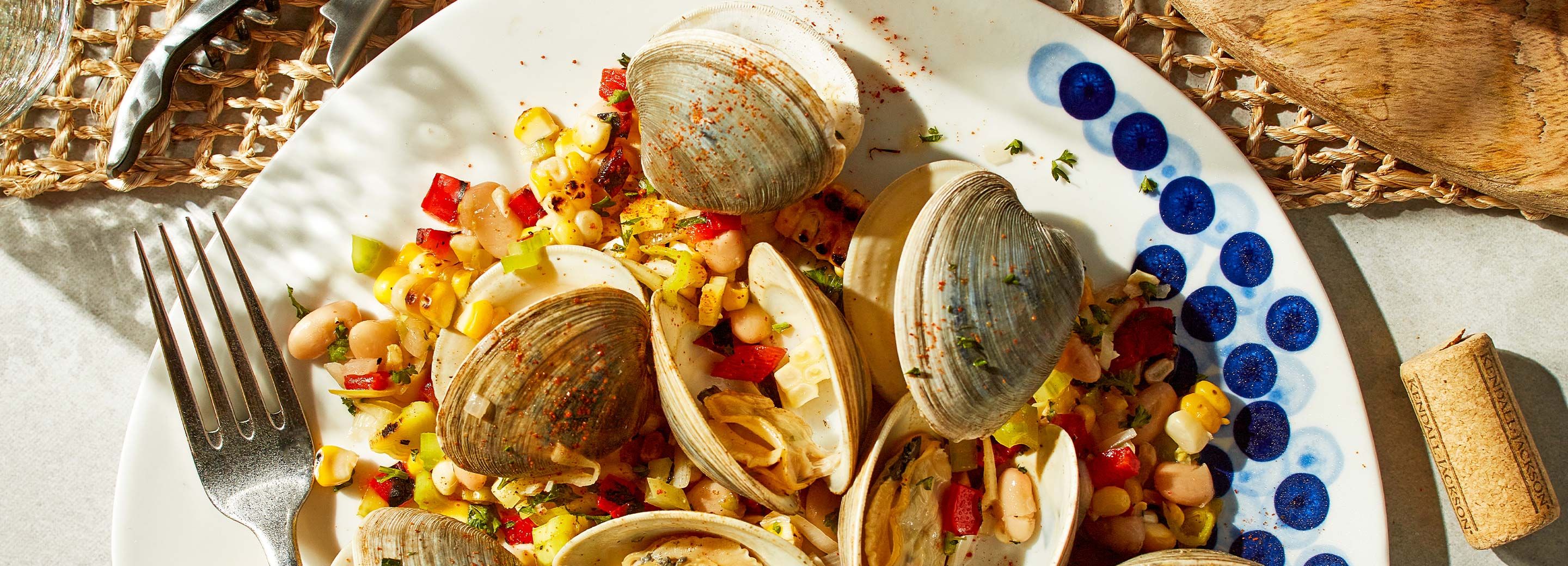 Farmed clams usually just need a quick scrub under running water. But if you buy wild clams, soak them in lots of cold water with a bit of kosher salt for 20 minutes, then drain before cooking. A generous pinch of cornmeal in the soaking water may help expel even more grit.