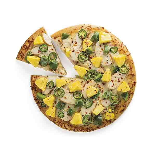 - Evenly sprinkle mozzarella over entire crust, then top with chicken breast, pineapple chunks, green pepper and jalapeño.