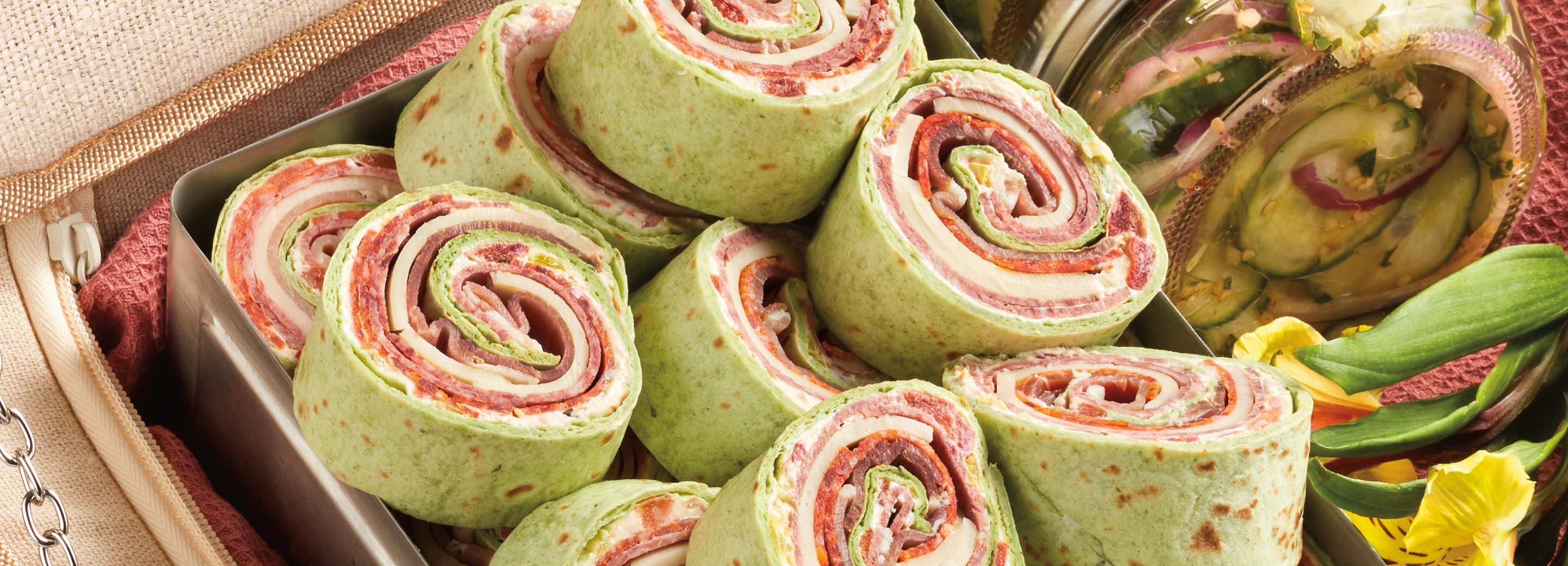 - Starting at end closest to you, tightly roll up each tortilla so that all ingredients extend from side to side; wrap each tortilla in plastic and refrigerate at least 1 hour or until firm. Keep in the fridge for up to 3 days.