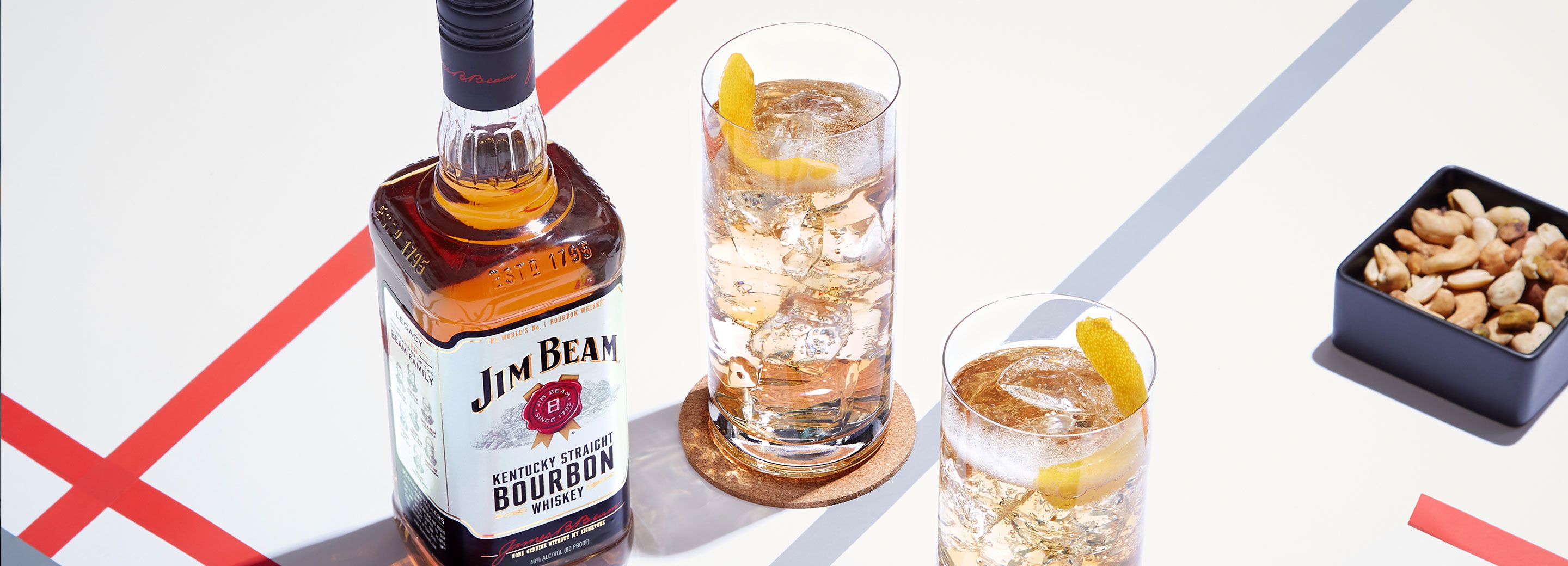 - In a tall glass filled with ice, add Jim Beam Bourbon Whiskey.