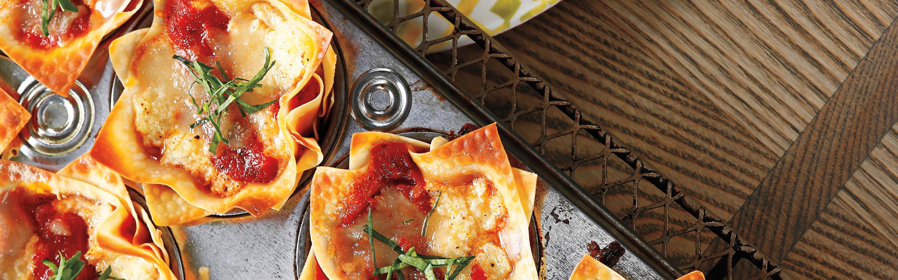 - Meanwhile, in medium bowl, combine 1 cup mozzarella, Parmesan, ricotta and pepper until well combined. Press 1 wonton wrapper into each muffin cup, pressing to bottom and sides. Divide about half the meat sauce between cups. Top some with half the pepperoni and others with half the mushroom mixture; add a spinach leaf or basil, if using.