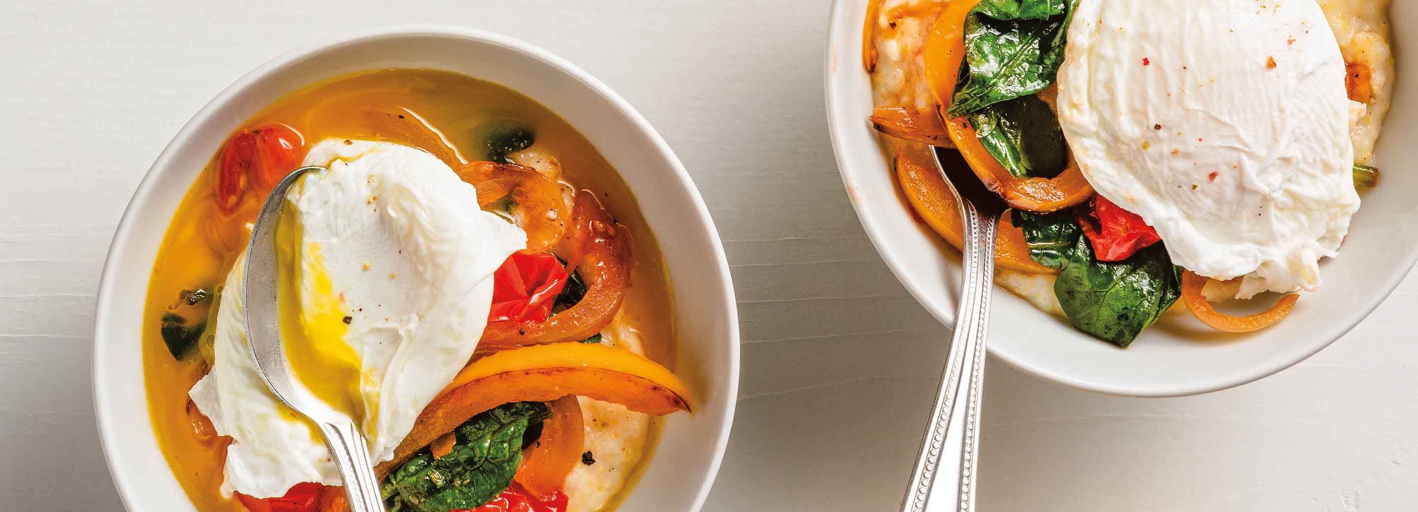 - Fill a medium pot halfway with water, add vinegar and bring to boil. Reduce heat to medium-low, until simmering. Crack eggs into water (gently and one at a time) and let cook 5 minutes. Place egg on top of prepared bowls, then season with salt and pepper, if desired. Serve Immediately.