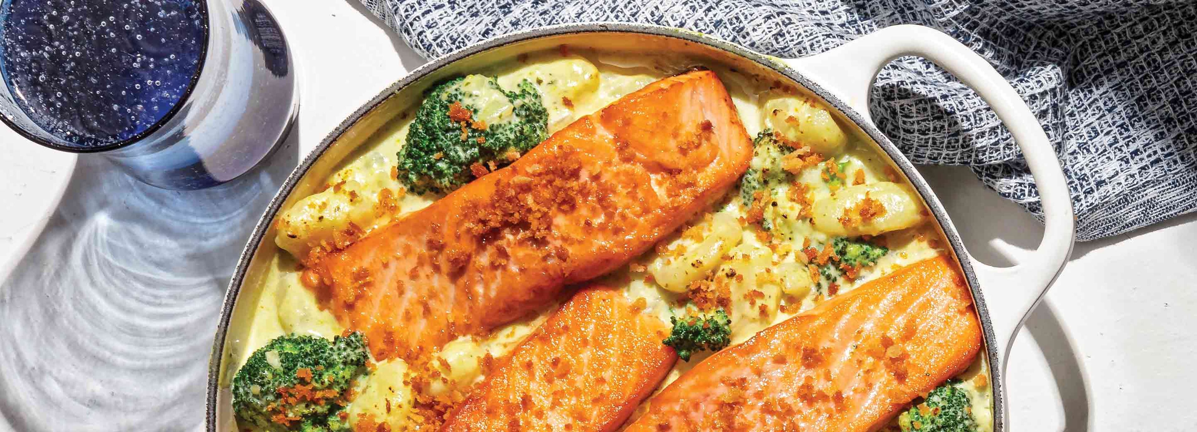 - Nestle salmon into gnocchi and scatter breadcrumb mixture over top. Add pan to oven and bake 10 minutes or until salmon reaches an internal temperature of 145 degrees and breadcrumbs are golden brown. Let cool 5 minutes and serve.