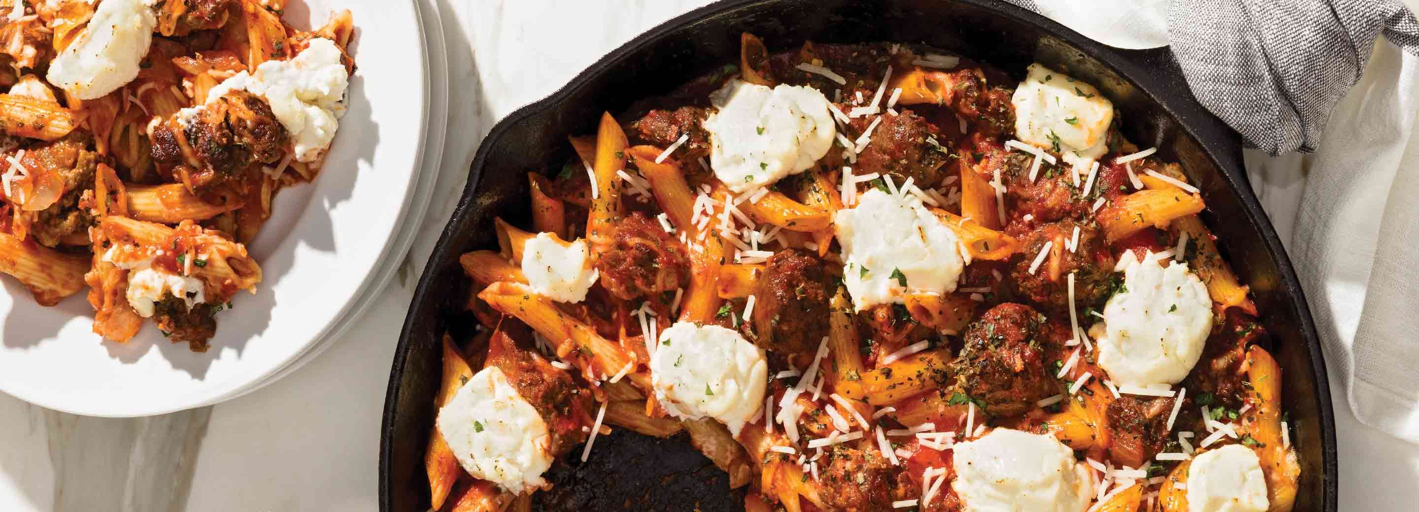 - Add penne and 1 cup water to skillet. Return to a simmer and cook 2 minutes, stirring frequently. Fold in mozzarella and top with dollops of ricotta. Cover with foil and bake until pasta is tender, 20-25 minutes.