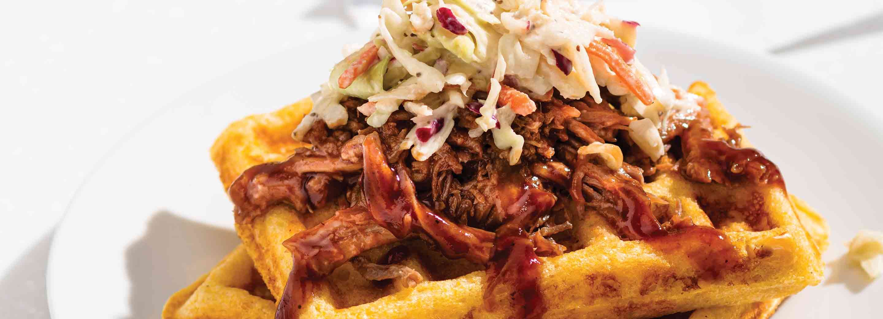 - Warm pork and toss in barbecue sauce. To serve, top waffles with pork and slaw.