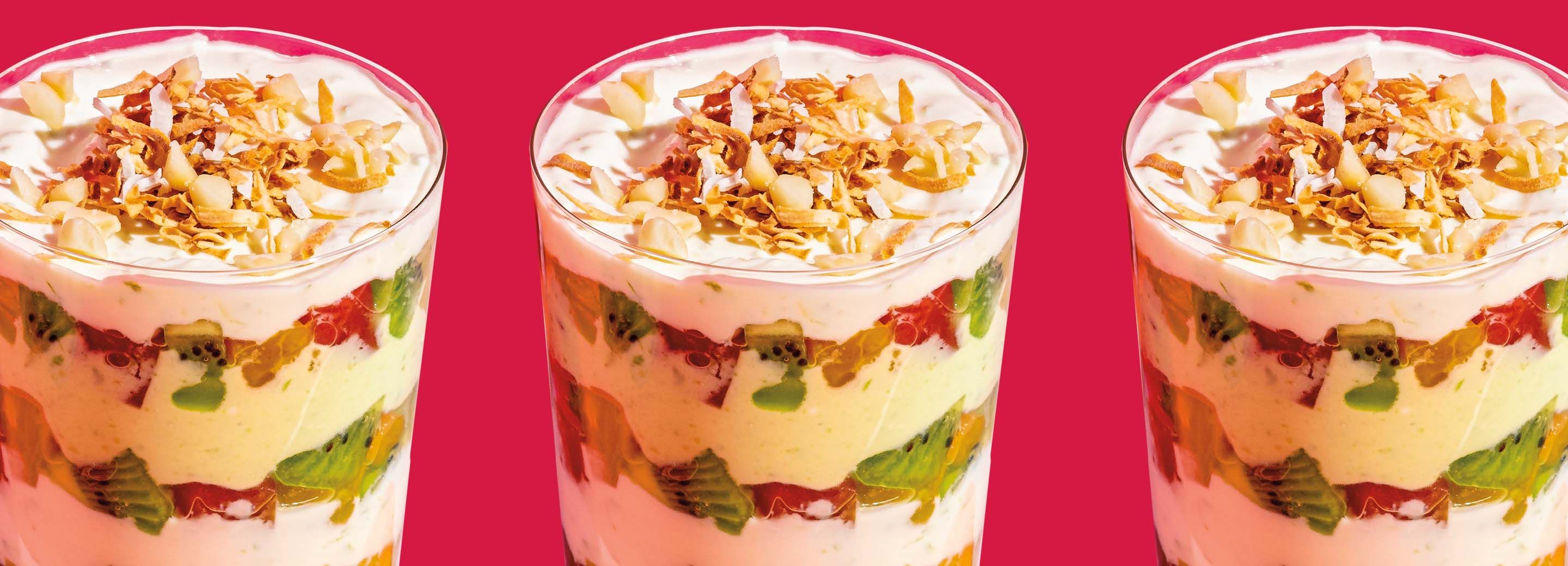 - Stir together half of yogurt, the avocado, half of honey and 1 teaspoon lime juice. In a separate bowl stir together remaining yogurt, lime juice, zest and honey. In two 10-ounce glasses, layer the avocado yogurt, fruit and the lime yogurt. Top with the toasted coconut and nuts.
