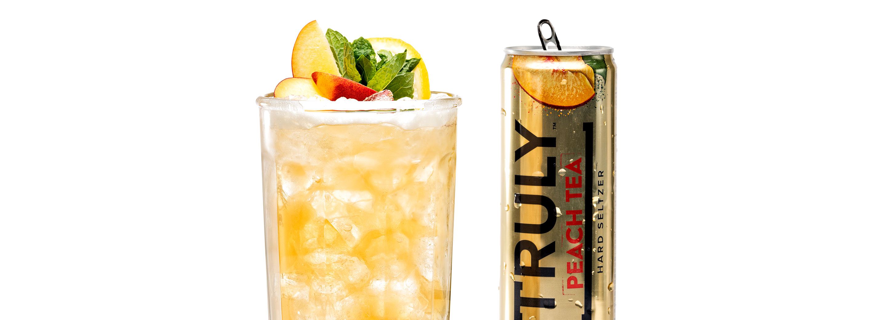 - Add Truly Peach Iced Tea to the shaker. Then, strain over fresh ice.
