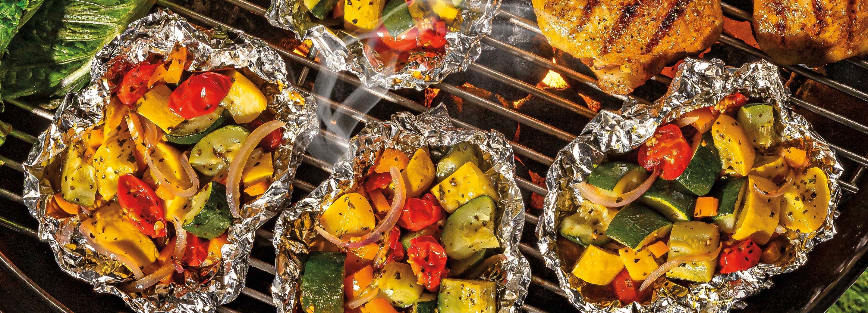 - Lay out four approximately 12x12-inch pieces of heavy duty aluminum foil. Divide the veggies between the foil. Make into a packet (see options below).