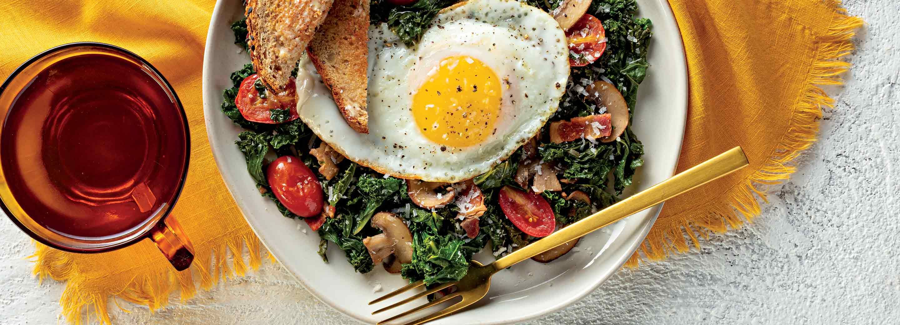 - Add onion to skillet with mushrooms and continue to cook until softened, 2-3 additional minutes. Stir in kale, tomatoes, bacon and mustard and cook until kale is just wilted. Remove from heat.